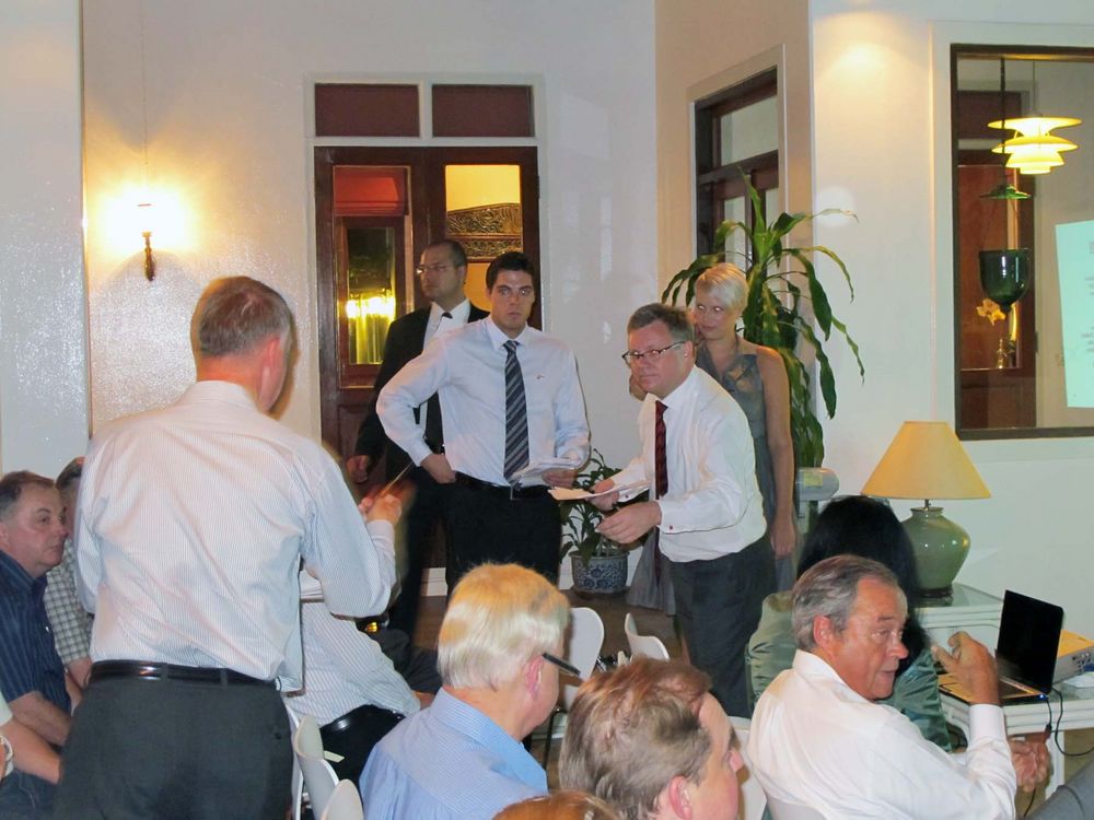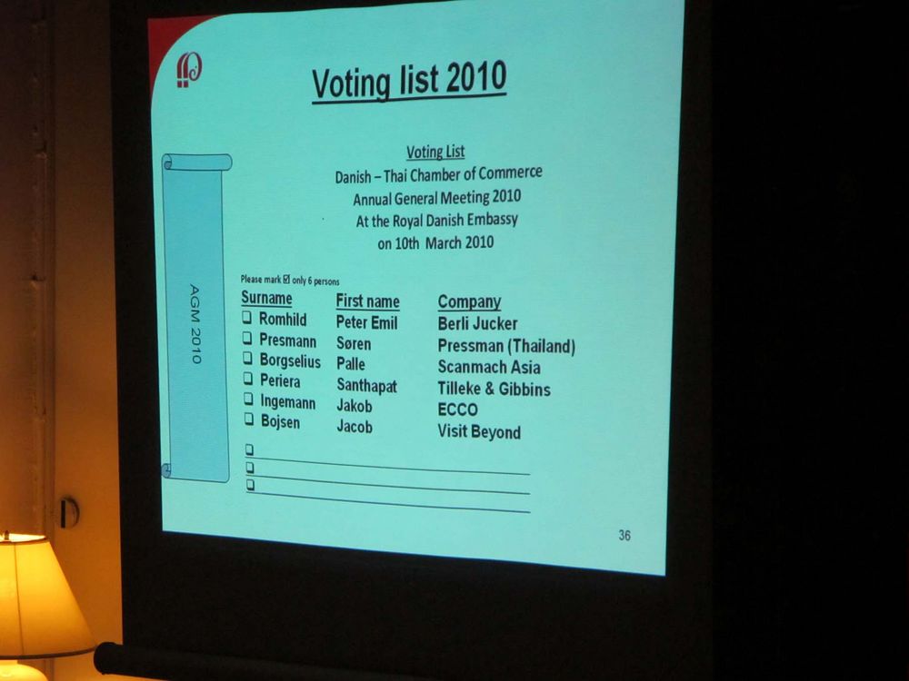 A new board of the Danish Thai Chamber of Commerce was elected on Wednesday evening 10 March 2010. Surprisingly, though, the original six candidates fielded by the board suddenly became seven candidates when Stig Vagt Andersen of Ben Adisti Co., Ltd. rose to his feet and announced his candidacy to the new board immediately prior to the election. So who would not be elected? Mr Vagt Andersen or one of the candidates proposed by the board?