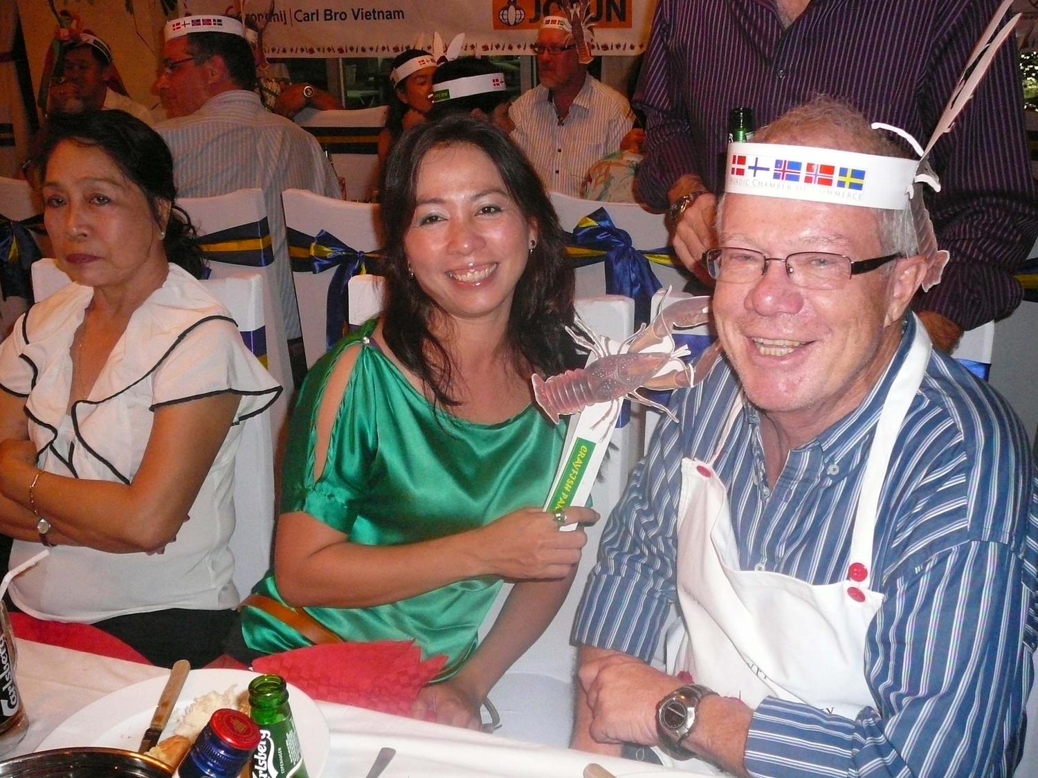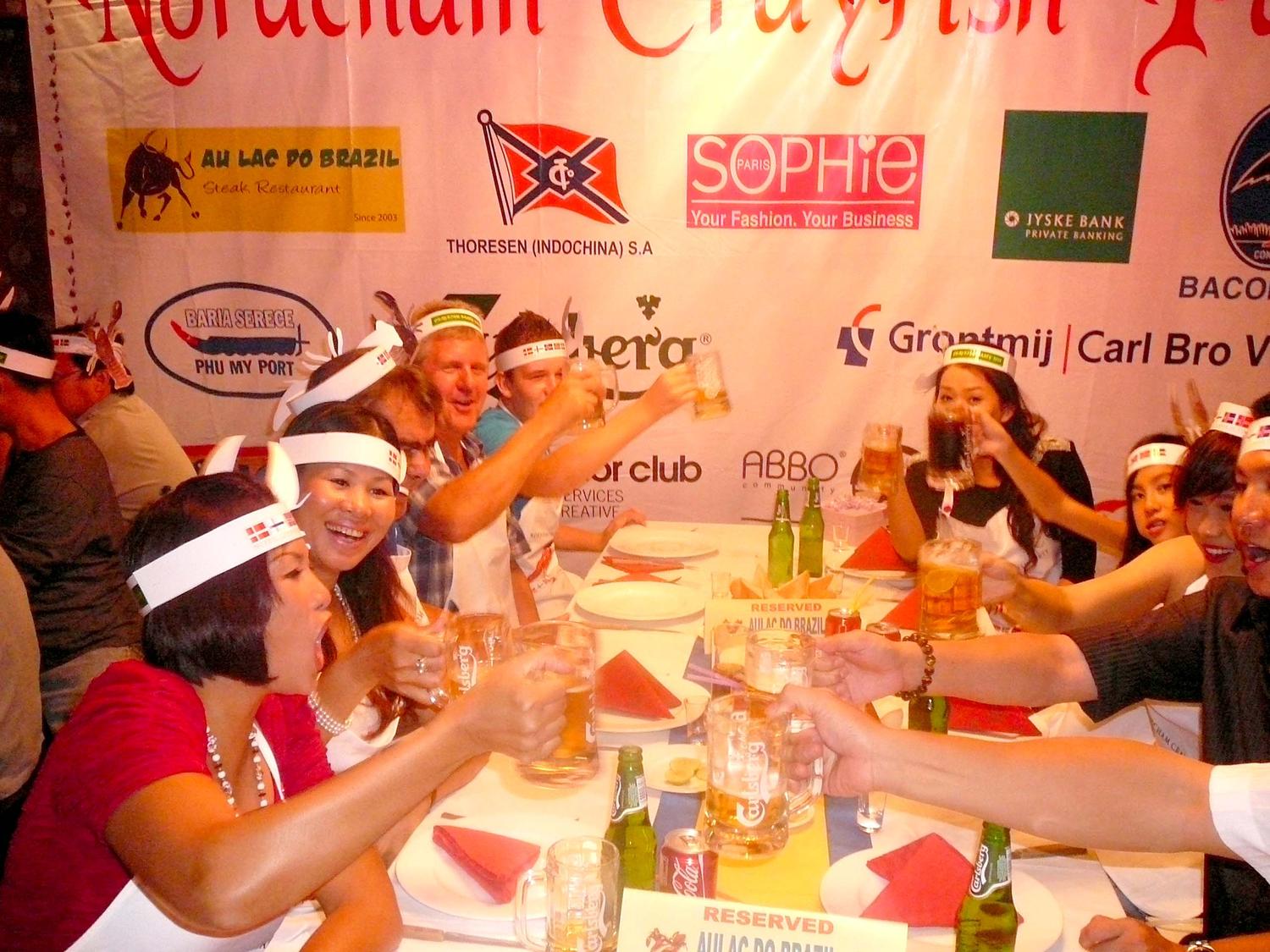 153 Nordic and Vietnamese people dressed in Crayfish apparel gathered at Swedish owned Au Lac Do Brazil restaurant in Phu My Huong on Saturday, October 2 for its famous and popular annual Crayfish Party. This truly Nordic Tradition this year had a record turnout and hosted spectacular games and Viking songs. The crayfish was directly imported and cooked based on a traditional Swedish recipe and was accompanied with Norwegian Aquavit.