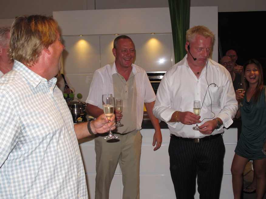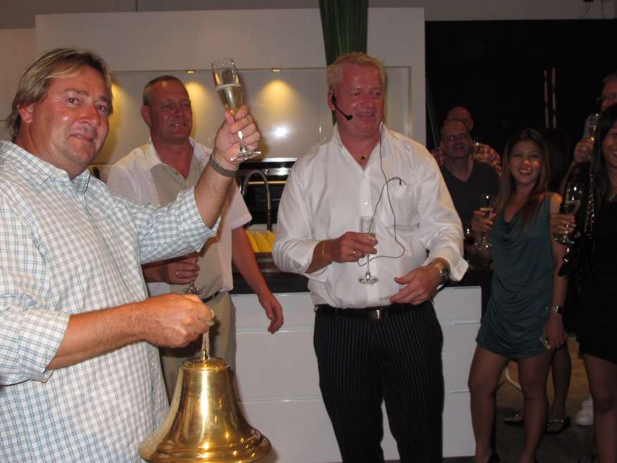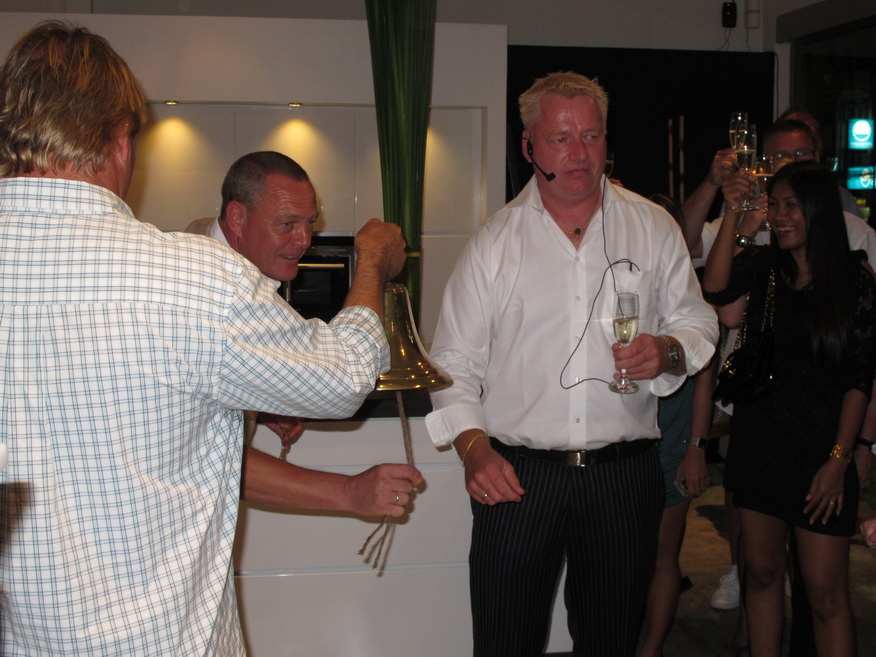 The owner of the franchise store Ole Frendesen welcomed all the guests on behalf of himself and his wife Majbritt. Later, Ole Frendesen and Carsten B Andersen, CEO of Kvik kitchens worldwide, performed the official opening. According to a Kvik tradition, this involves ringing of a big ship bell and a video link back to the head office in Denmark. Here the staff enthusiastically took part in the opening in Hua Hin, waving Thai and Danish flags and cheered in champagne – untill Carsten B Andersen jokingly remarked “..OK, that’s enough! Now, you can all get back to work!”
