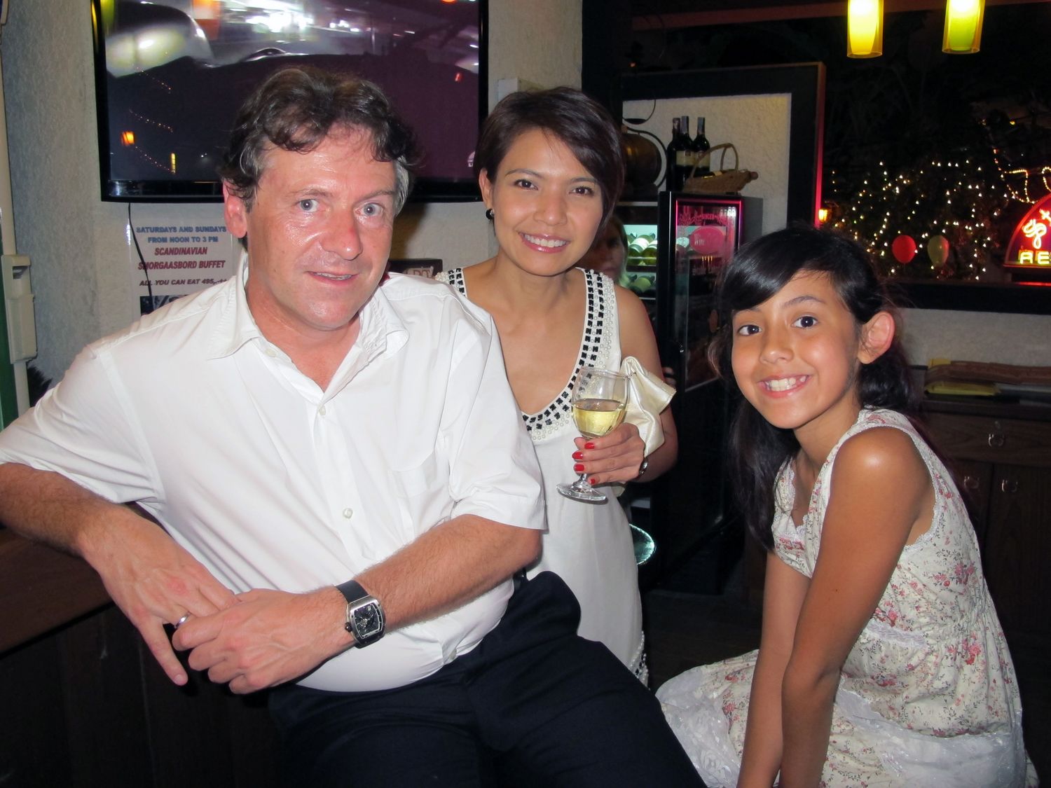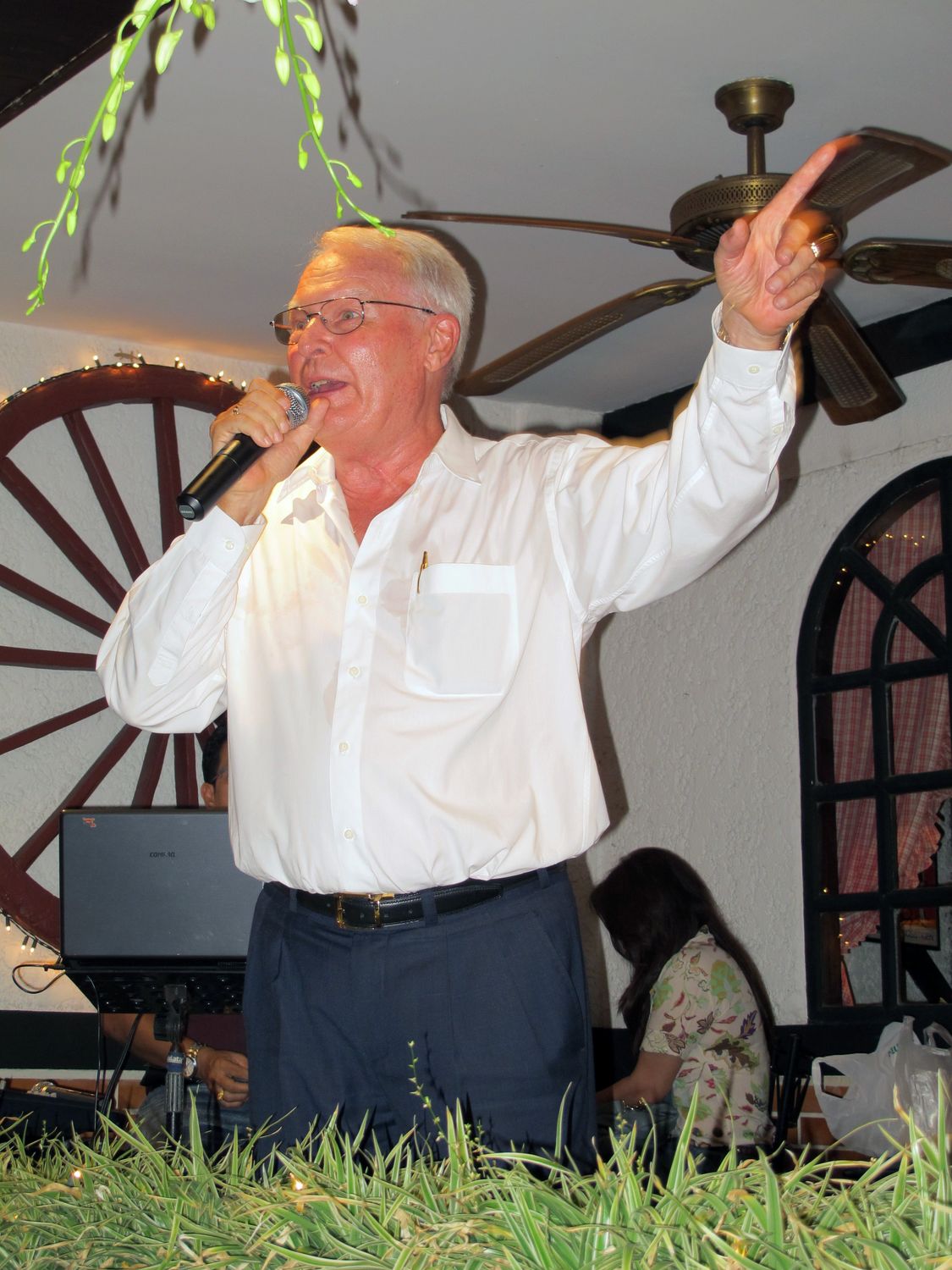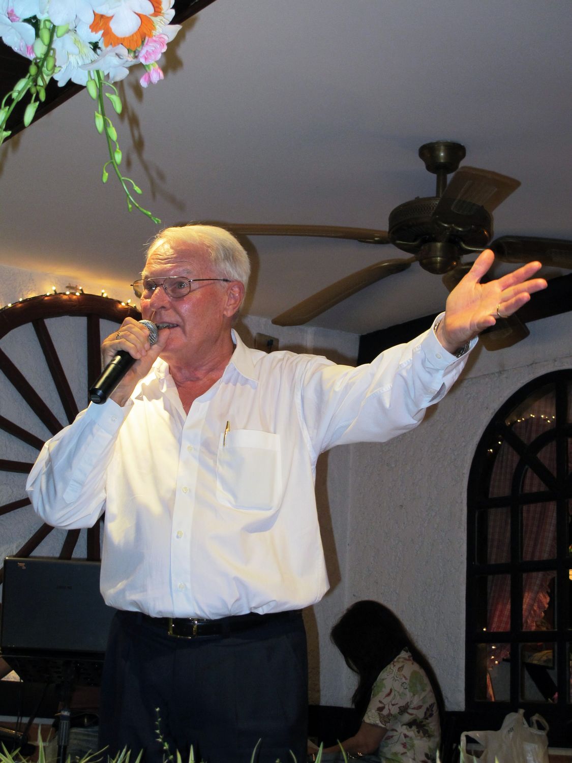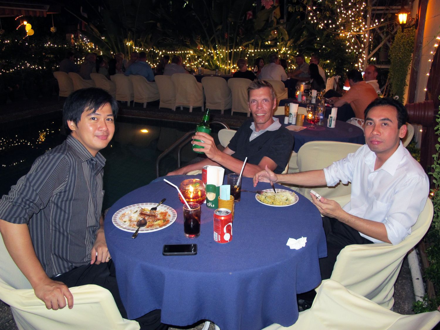 “Tonight we will have dinner together and please donate to help flood victim in Thailand. Earlier this evening, my wife jumped into the pool to get the money that one of you threw there. Just give it to her, don’t let her jump again!”