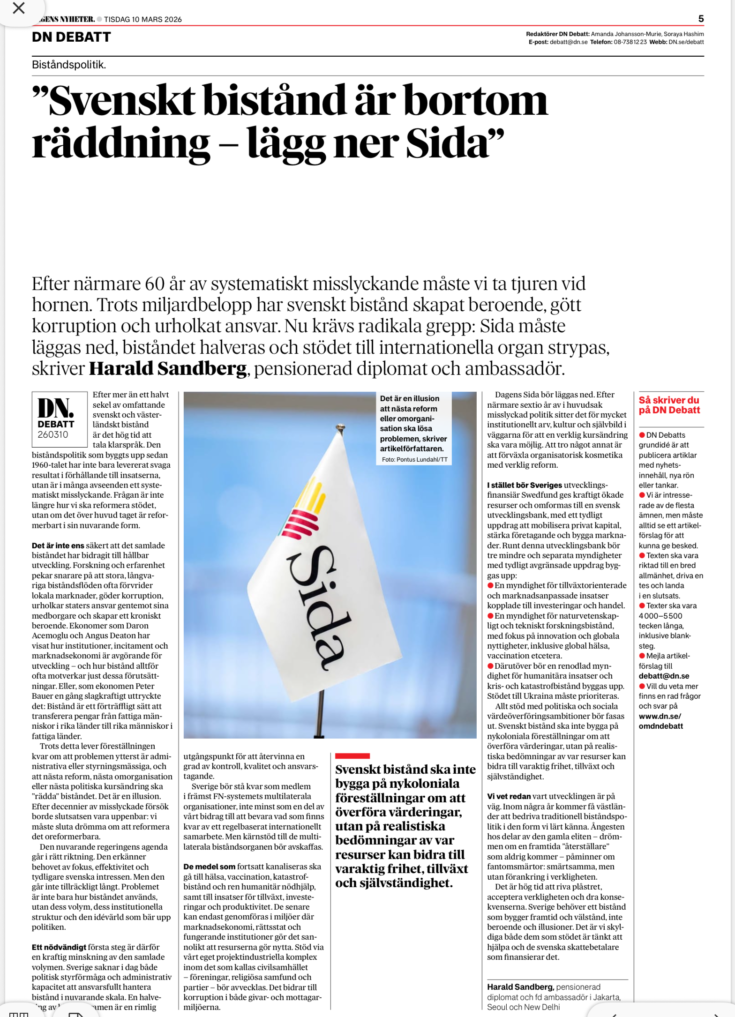 In a debate article published in Dagens Nyheter on Tuesday 10 March 2026, ambassador Sandberg writes that Swedish aid is “beyond rescue” and calls for the country’s development agency Sida to be closed.