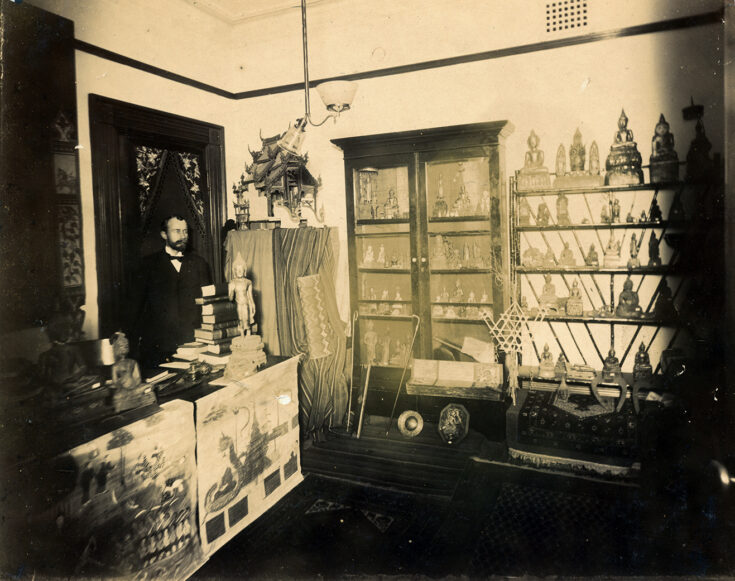 The 1929 “Bangkok Daily Mail” article calls him “a well-known curio collector” and states that “both the rear portion and second floor of his dispensary were packed to capacity with objets d’art, some of them of great value, because of their rarity and indisputable authenticity. There were very few tourists to the capitol who, during their stay, did not pay a visit to the Lotus Dispensary to see the late doctor’s collection. . .