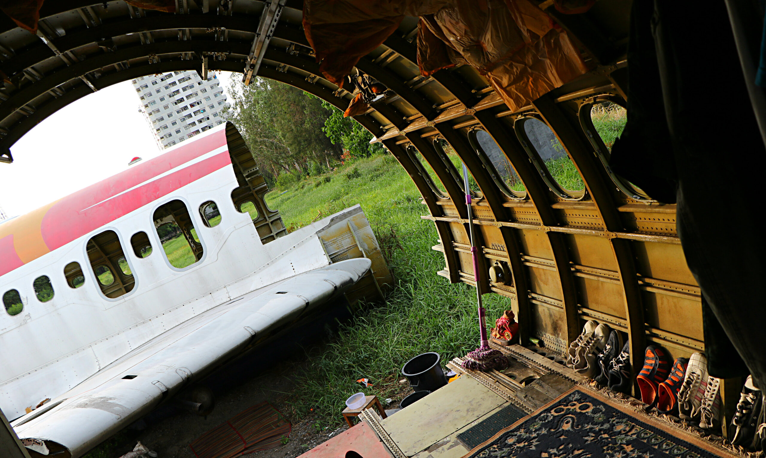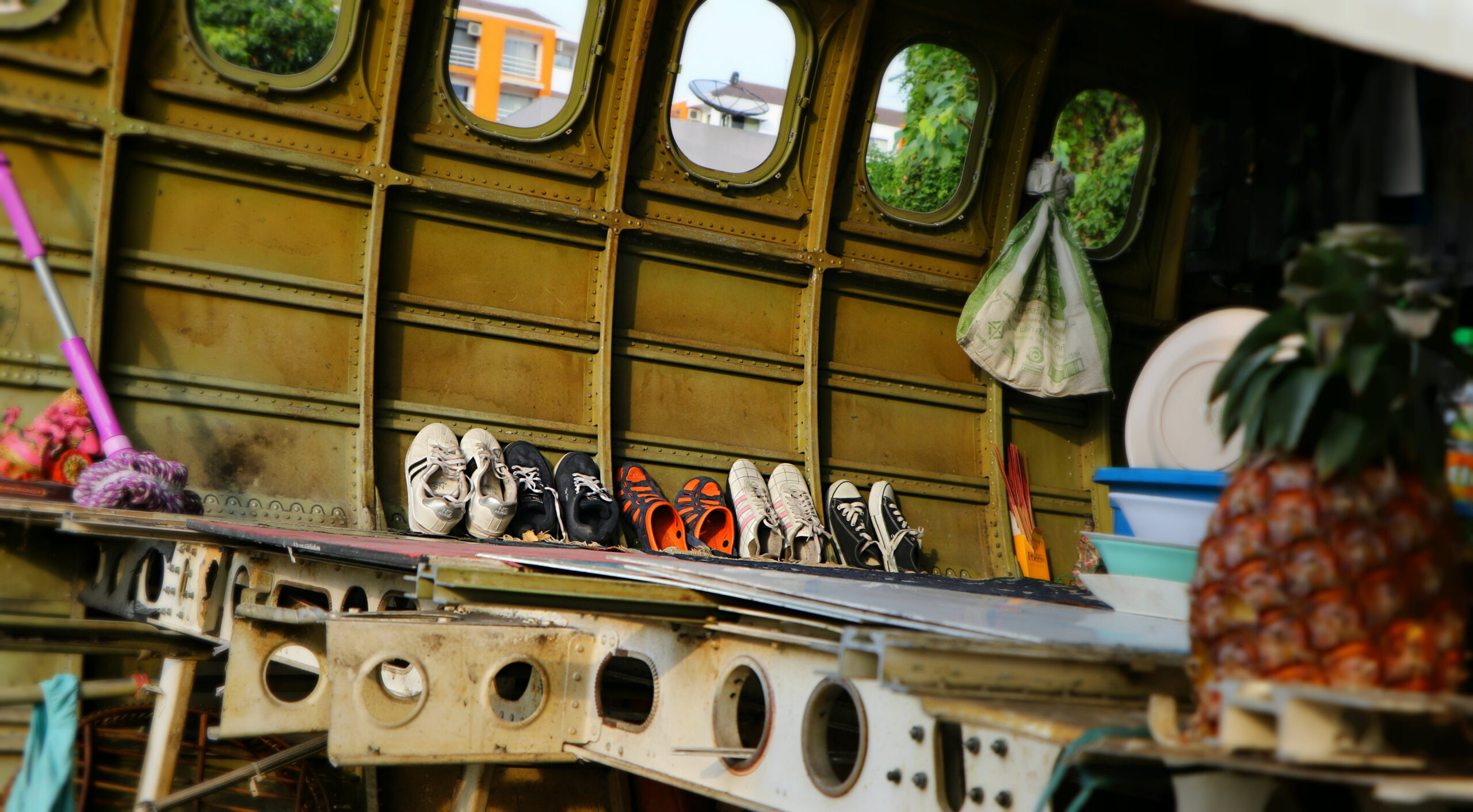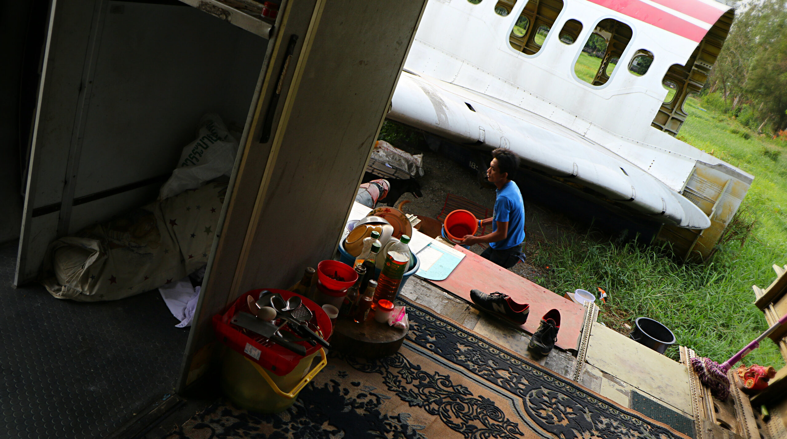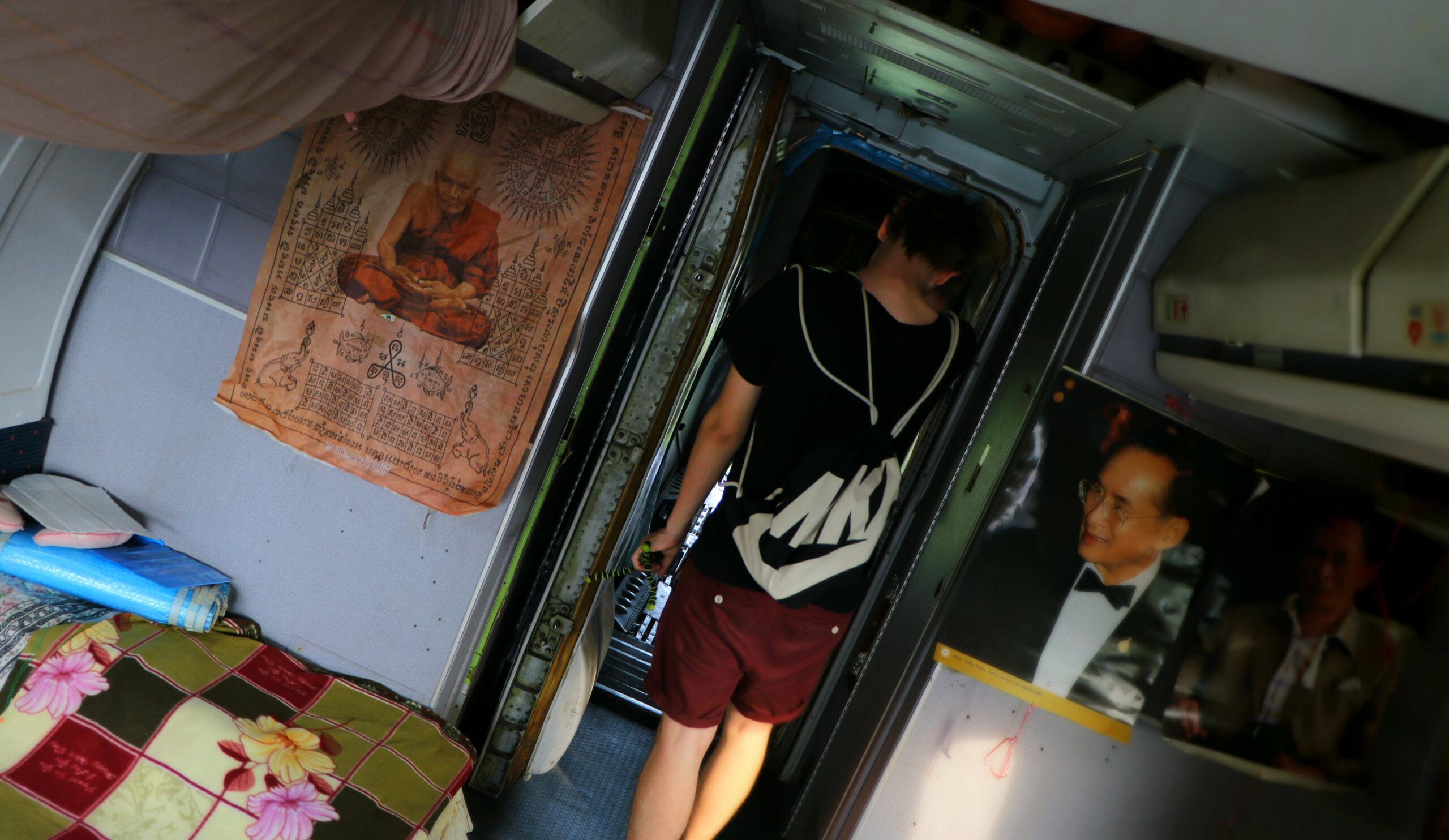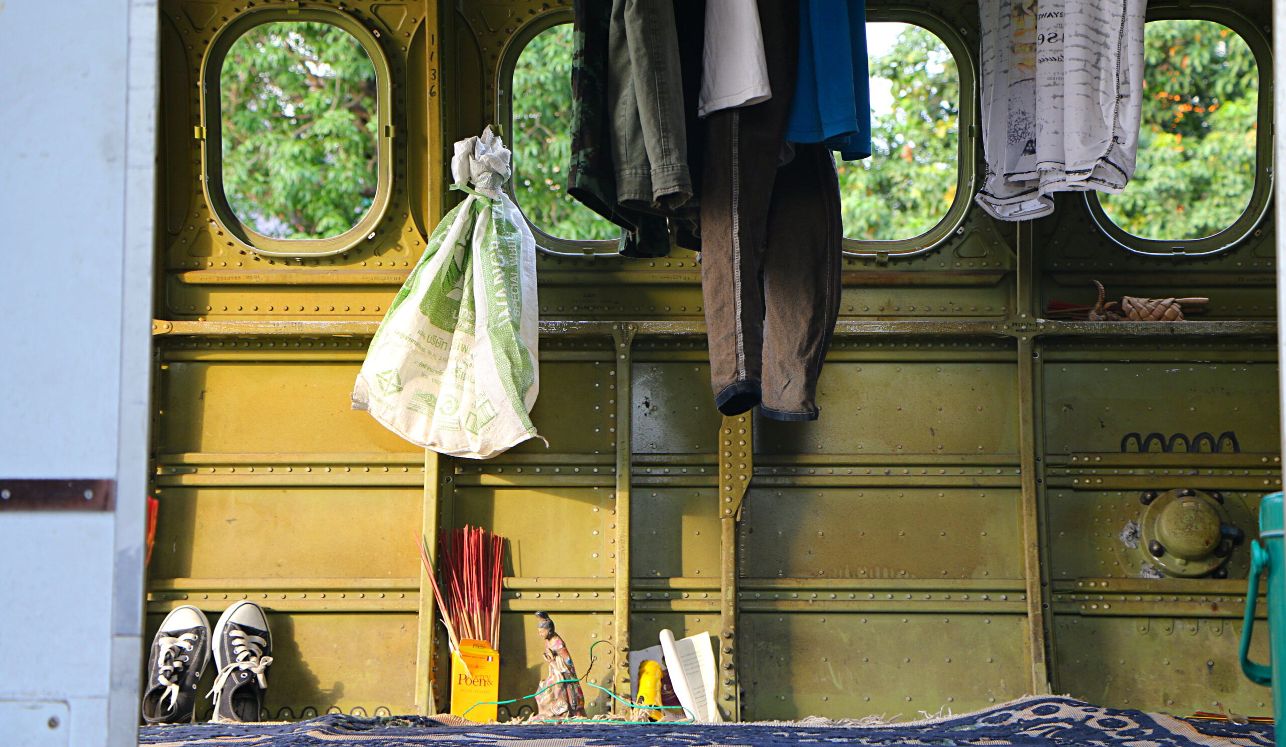 After welcoming his loyal friends the plane man invites us to have a look inside. “Just go and look” he says and points at some tires we can jump up on to enter the ‘living room’.