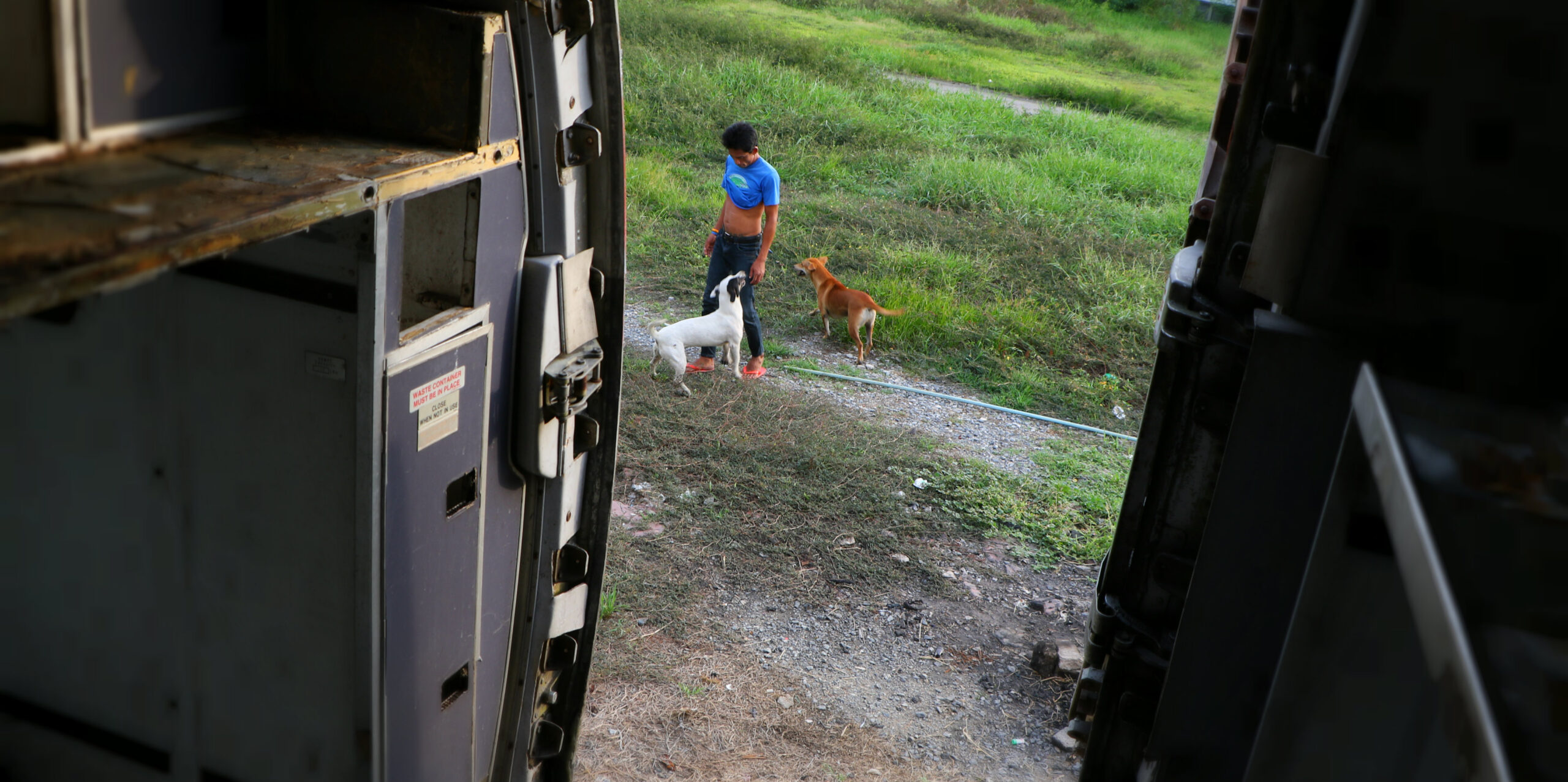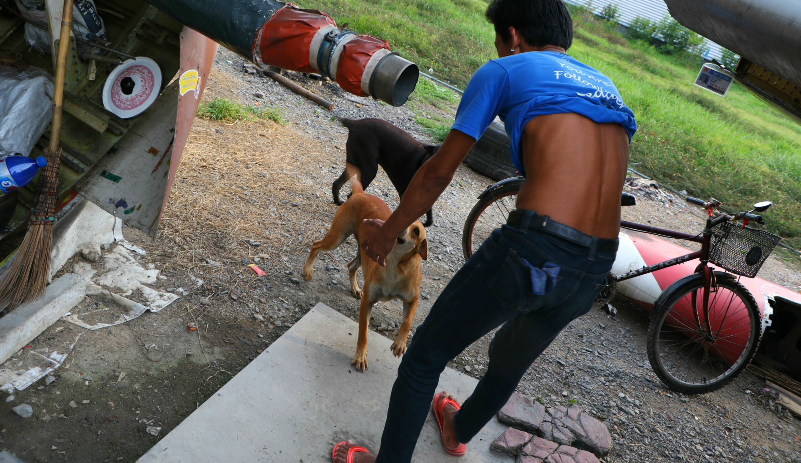Opposite the Disney movie, when Simba ‘laughs in the face of danger’ it is not three hyenas welcoming you, but a humble man on his bicycle and his three beloved dogs. The plane is his home.