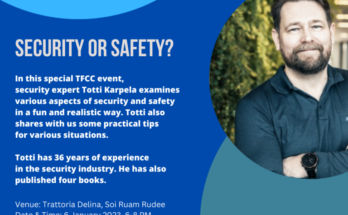 The Thai-Finnish Chamber of Commerce (TFCC) invites any interested attendees to join the event, “TFCC Special: Security or Safety” on Friday, 6 January 2023 at 6 pm, Trattoria Delina, Soi …