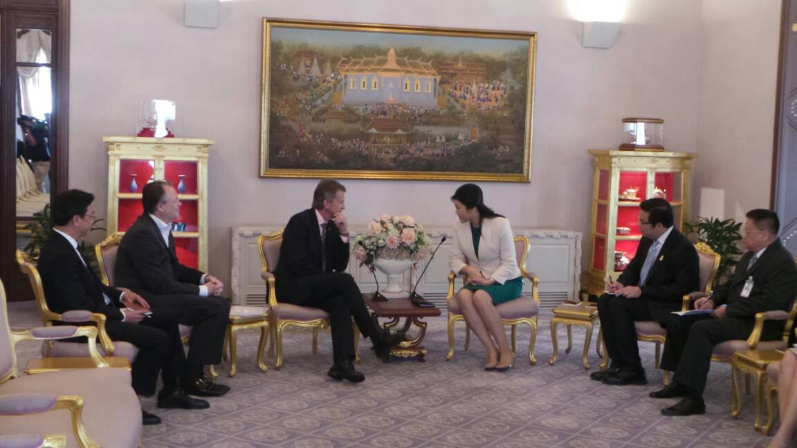Thailand’s Prime Minister Yingluck Shinawatra this morning welcomed Mr. Jon Fredrik Baksaas, President and CEO of Telenor Group, Norway and Mr. Jon Eddy Abdullah, CEO of DTAC, at Violet room, Thai Khu Fah building, Government House.