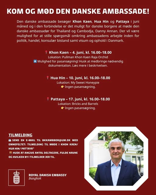 The events will take place in Khon Kaen, Hua Hin, and Pattaya, offering attendees the chance to learn more about the embassy’s work in politics, trade, consular assistance, visas, and residence in Denmark.