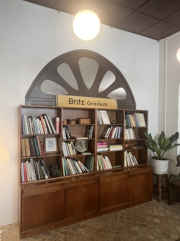 The shop also features a bookstore corner, displaying a collection of Danish and Swedish-language books, all available for purchase.
