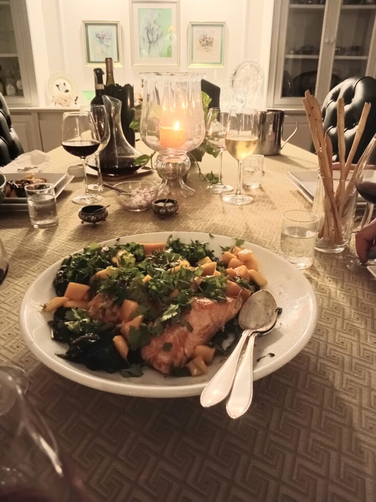 People usually say “the more cooks, the worse the soup”, but that wasn’t the case for us. We helped each other prepare salmon fillets on a bed of spinach in the oven, and one of us made the most amazing salad where every ingredient was cut into exactly the same tiny size-that certainly wasn’t me.