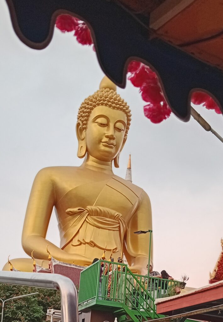 The long tail boat took us along some of the canals, passing the enormous golden Buddha, stopping at a place where one can buy art, vintage things etc. have something to drink or just look around. On our way, we could wave to the lazy, big monitor lizards lying lazily in the sun along the canals.