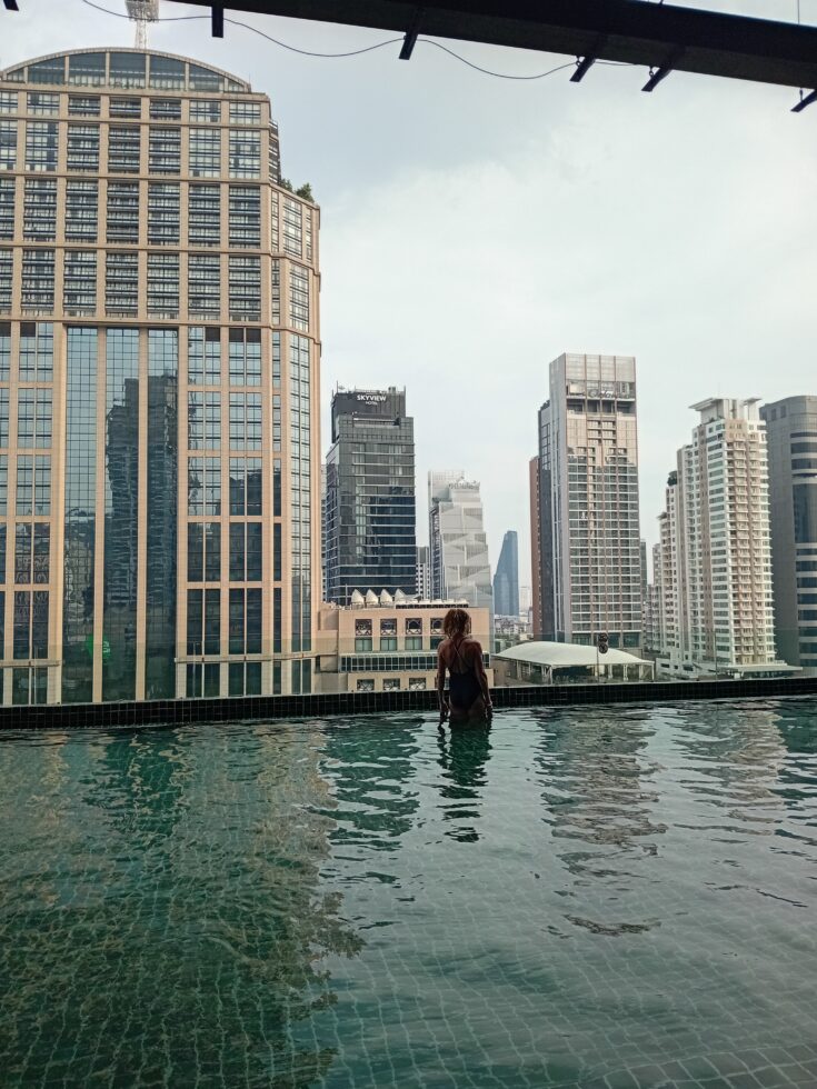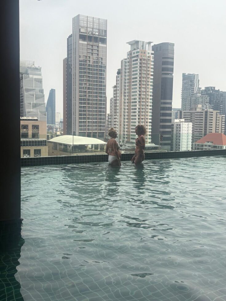 We were warmly greeted by the manager and showed to our big sofas by the edge of the pool. Here the view is great, behind the pool bar you can see the Sky trains rushing by and part of the skyline.