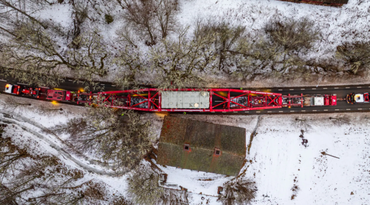 Because the load is too heavy for rail transport, the convoy moves slowly along the roads at speeds of around 5 km/h before reaching the port.