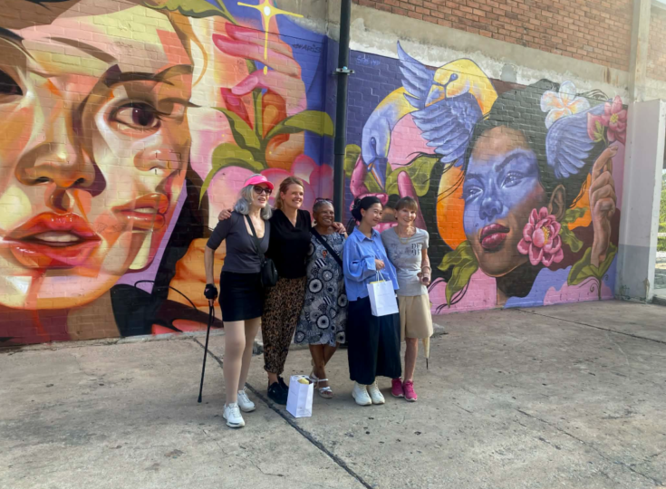 The painting she created in Bangkok together with Waris centres on women from different parts of the world. In the mural, they pass flowers to each other.