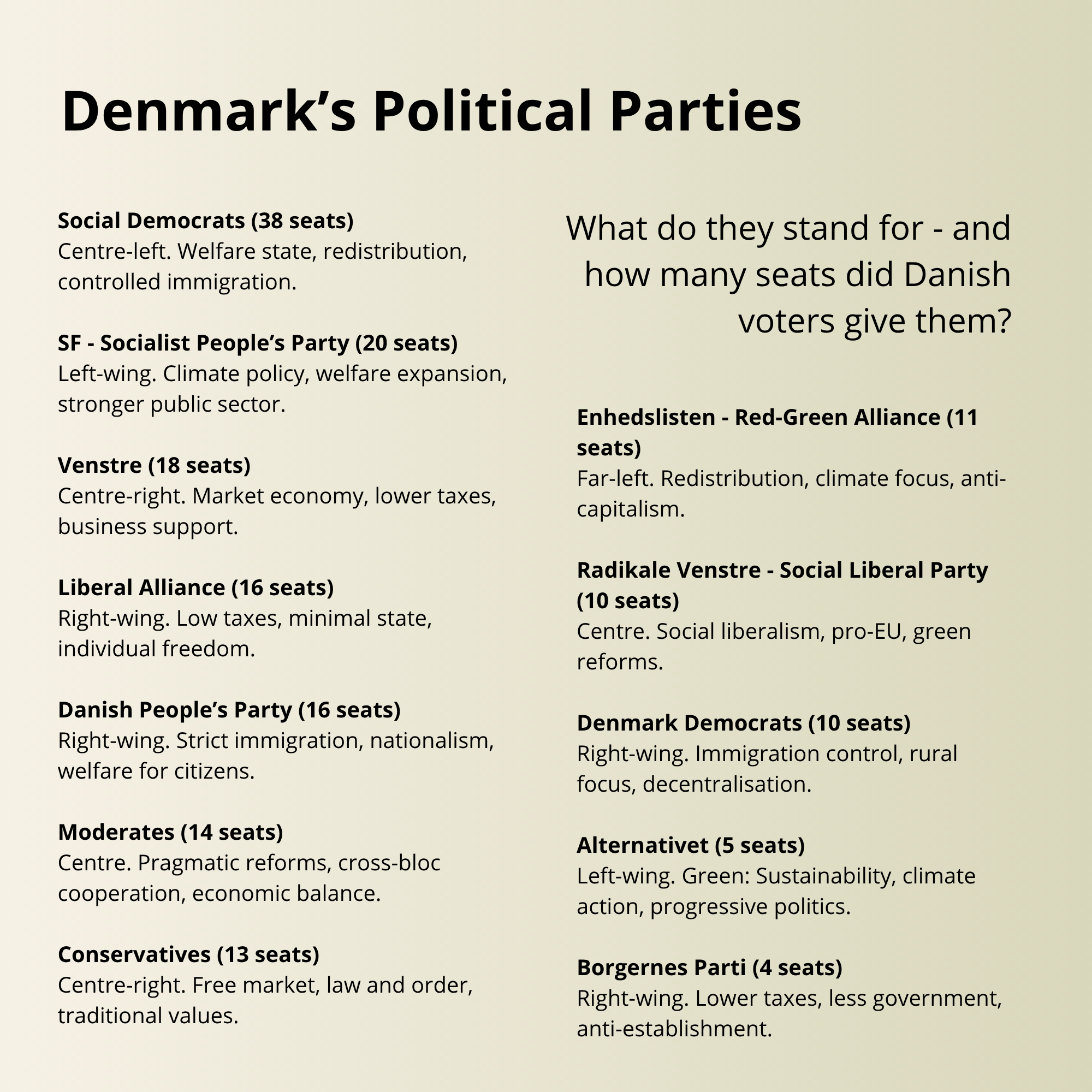 Denmark has just held a general election, deciding the composition of its 179-seat parliament.