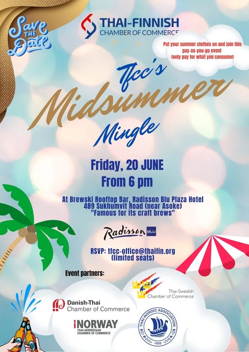 The Thai-Finnish Chamber of Commerce is hosting a Nordic Midsummer Mingle on Friday 20 June 2025 at the Brewski Rooftop Bar, Radisson Blu Plaza in Bangkok. The informal event is open to members of all the Nordic chambers in Thailand as well as the Thai-Nordic Association.