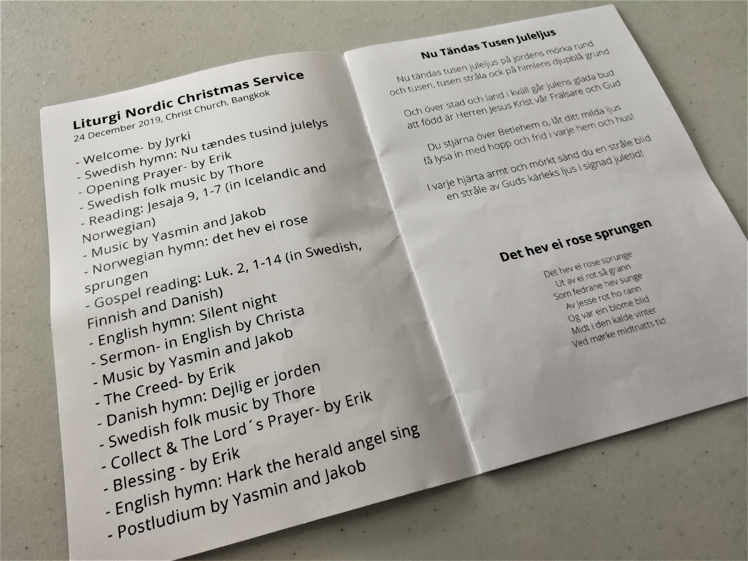 The Nordic Churches in Bangkok brought attendees together with a joined service on the day of Christmas Eve. All four languages were represented during the service with hymns, readings and sermon changing between Swedish, Norwegian, Danish, Finnish and English.