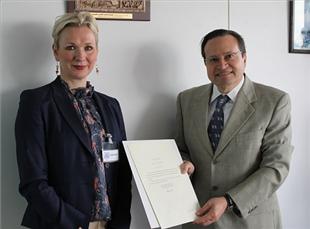 Kristin Stockman, First Secretary of the Royal Norwegian Embassy to the United Kingdom, handed over Norway’s instrument of accession to the Hong Kong International Convention for the Safe and Environmentally Sound Recycling of Ships, 2009, to Mr. Gaetano Librando, Head, Legal Affairs Office, Senior Deputy Director, Legal Affairs and External Relations Division, IMO on 26 June 2013.