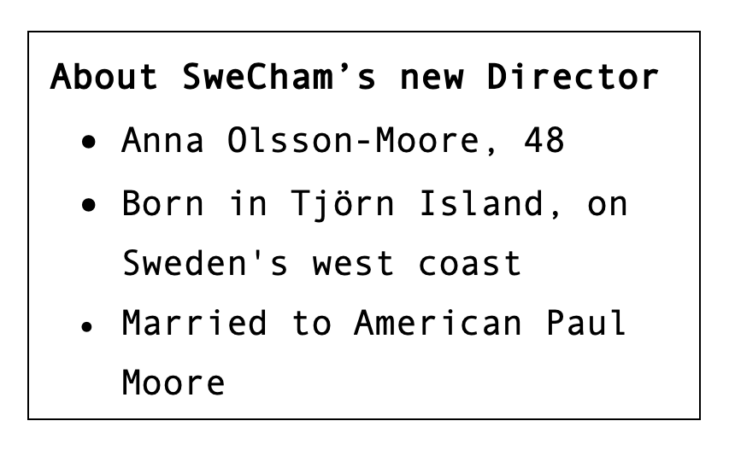 “I think I can drive this chamber into a brighter future with more diversity and more innovation together with the Swedish companies. I want to work on seminars and workshops that benefits and covers the needs for our members and represent their interests on issues that impact their operations, such as regulatory changes, industry challenges, and new trade agreements.”