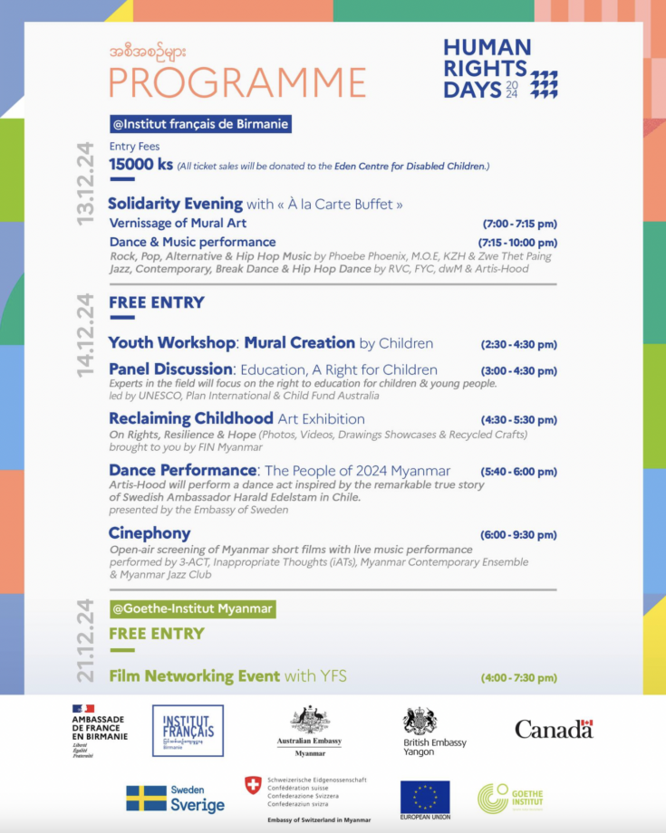 - December 14: A Youth Workshop where children aged 6 to 13 will create murals focusing on human rights, alongside a panel discussion on the right to education. The day will culminate with the dance performance by Artis-Hood and an open-air screening of Myanmar short films.