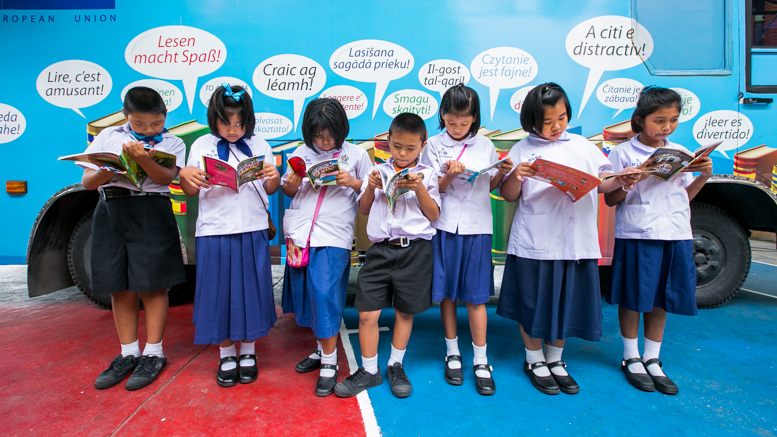 EUNIC Thailand and EU joined forces with the BMA and launched the “EUNIC-Bibliobus” in Bangkok on September 11. The mobile library contributed to Bangkok World Book Capital 2013 was officially ready to go “on tour“, bringing over 200 titles of translated European children books to Thai children while spreading the motto “Reading is fun!”.