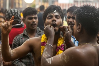 Once a year 20.000 Tamils in Singapore celebrate Thaipusam. The festival is a tribute and thanksgiving to the Hindu god Murugan who protect the religious and fulfill their wishes. This happens by the ritual of bringing milk from the Srinivasa Perumal Temple on Serangoon Road to the Thendayuthapani Temple on Tank Road. All of the devotees are dressed in yellow or orange colors as they are associated with Lord Murugan. Some of the devotes pierce their bodies. They are in a trance throughout the procedure, and there is no bleeding. Their ardent faith, together with the support of family and friends who help with rhythmical drums and shouting, makes the pain tolerable. Many of the devotees pierce their tounge and cheeks, this is to symbolically give up their ability to speak and offer their full concentration to the Lord Murugan. Some of the male devotees carry a large, heavy canopy which is anchored to their flesh with small hooks. To endure this they have prepared for weeks with prayer, vegetarian diet and celibacy to purify the soul.