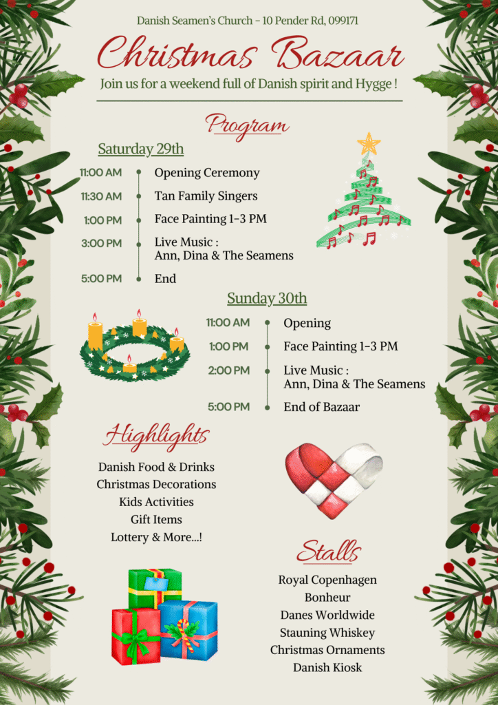 The Danish Seamen’s Church Singapore is hosting its annual Christmas Bazaar this weekend, November 29 and 30, with festive activities running each day from 11:00 AM to 5:00 PM.