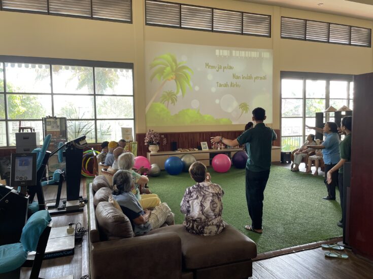 When I step inside Hovi Club Teuku Umar in Denpasar, cheerful music fills the room. About twenty seniors are stretching and moving in rhythm, following simple dance steps shown on a screen. There is laughter, clapping, and an ease that feels more like a social gathering than a care facility.