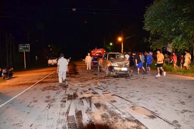A TATA pickup truck with a plate number บว 7766 Rayong and a white Ducati motorbike, 650cc, plate number อทษ 178, were also found at the scene of the accident. Both vehicles were damaged. Next to the pickup truck was the driver Ms. Chanat Suwannachote, 58, a resident of Rayong.